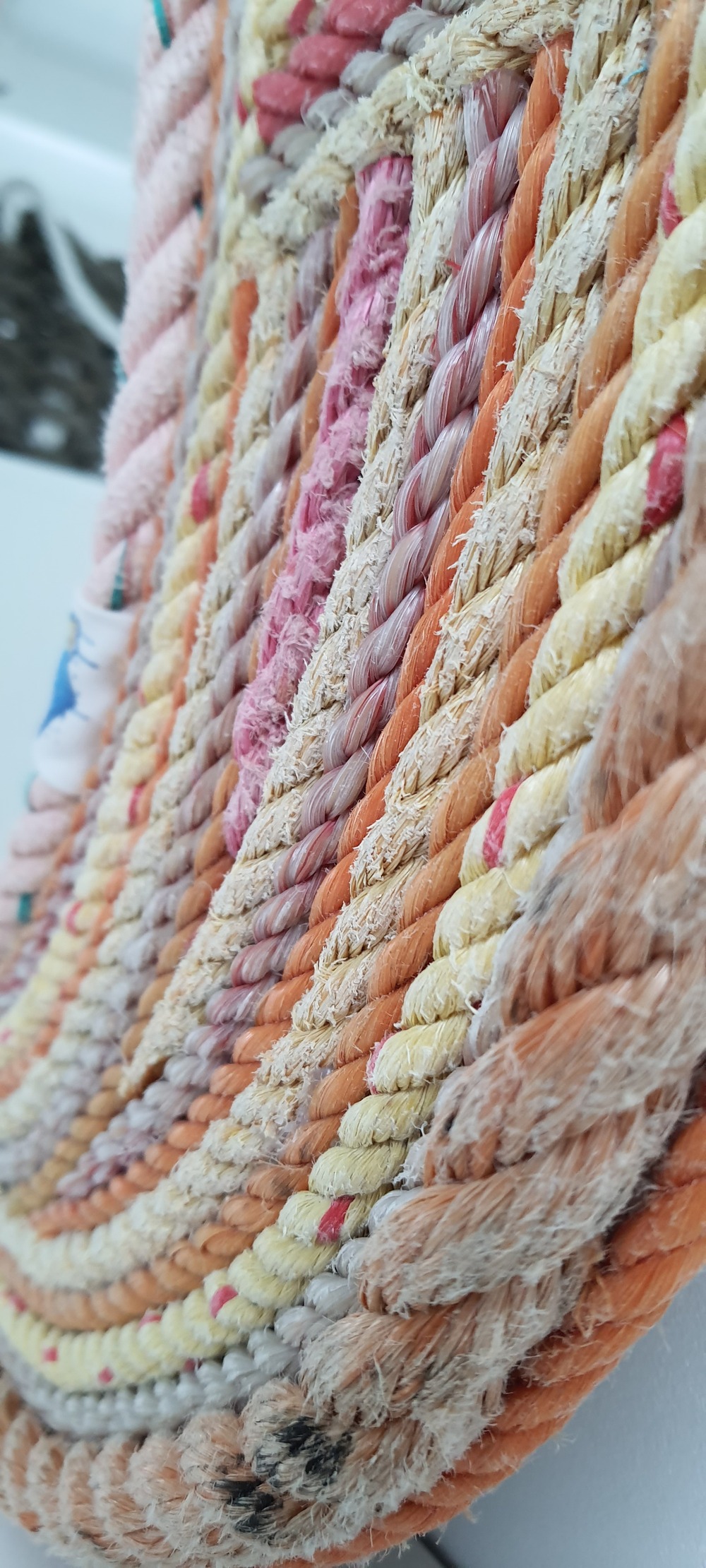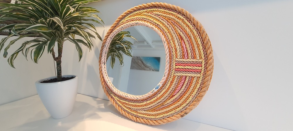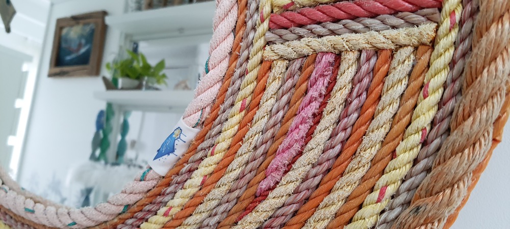 Ook deze spiegel is toch een plaatje. handgemaakt en gebruik gemaakt van gerecycled OceanTrash touw uit zee Vrolijke kleuren bij elkaar gezocht. Ca. Ø60cm Al het touw dat OceanTrash gebruikt is tweedehands, heeft in zee gelegen, is van het strand gejut. Elk product dat geleverd wordt is uniek, de spiegel zichtbaar op de foto is ook de spiegel die je thuis krijgt.